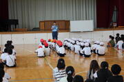 体育館では、防犯サポーターの方のお話を真剣に聞き、教室に戻り、振り返りを行いました。