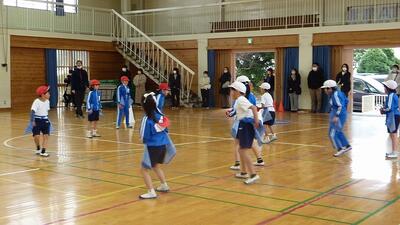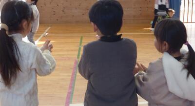 体育館では、竹とんぼの飛ばし方を教えました。この赤い竹とんぼは、先日地域の方からプレゼントされ、飛ばし方を教わったばかりです。上手に教えていますね。