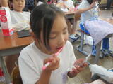 その後、正しい歯みがきの仕方を教えてもらい、早速歯みがきです。歯ブラシを縦横自在に扱い、上手に磨くことができました。きれいになった歯で、記念の1枚。これから、虫歯のない歯を目指していきましょう。