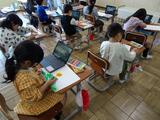3年生の体育は、体育館でマット運動です。よく見ると、みんな帽子に花をつけています。これは、前転をするときに頭頂部がマットについていないか、確認するためのものです。上手に回れる子は、花はきれいなままですが、頭頂部をつけてしまう子は花がつぶれてしまいます。ビデオでは分からない微妙な部分も、これなら一目瞭然ですね。