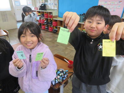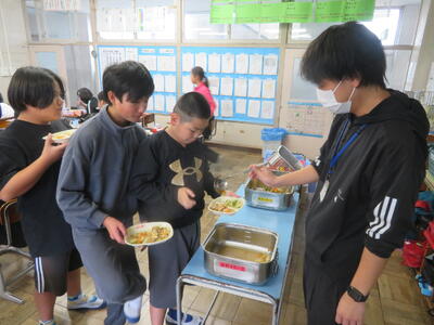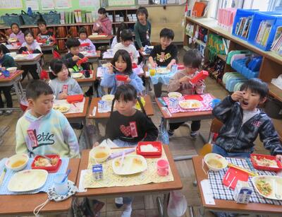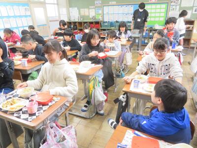 給食週間 投稿: 承認者 (15:02) 今週は給食週間です。望ましい食習慣を身に付け、好き嫌いなく食事できるよう取り組んでいます。5年生の教室ではみんなで楽しく食事をしていて、おかわりの列もできていました。 1年生も元気いっぱいで、みんな給食が大好きな様子でした。完食した児童にはペロリ賞、苦手な食べ物を頑張って食べた児童には頑張り賞が渡され、励みになっています。 -
